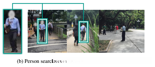 现有主流的人行重识技术主要依赖于经裁剪的人行照片作为核心数据来源。如图(a)所示,在这一过程中,人工或借助算法手段将行人图像进行精确切割。这种处理方式不仅提升了数据质量,并且有助于从单一视角深入探究提高人行重识准确率的方法;然而,在实际应用中由于存在大量复杂背景干扰因素的存在而面临诸多挑战