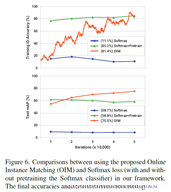 OIM和Softmax之间的对比分析,在训练阶段的身份识别准确率和测试阶段的人搜索平均精度曲线如图所示。