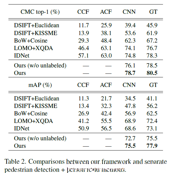 从表2可以看出,在行人检测领域中detectors选择对于行人数目识别任务的效果提升具有至关重要的作用。可以看到这些模型(CCF、ACF、CNN和GT)之间存在显著的差异性。如果采用现有的 detector,则可能会导致行人重识别效果受限
