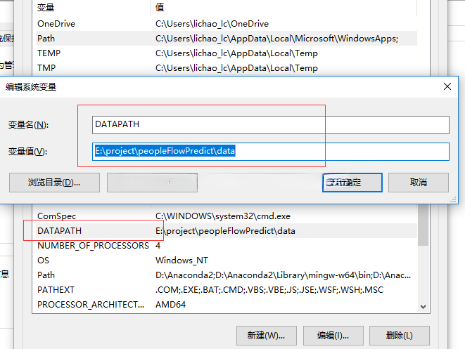 4. 添加数据的路径到环境变量(诡异的很):建立DATAPATH,对应的值为数据路径(如:E:\project\peopleFlowPredict\data)