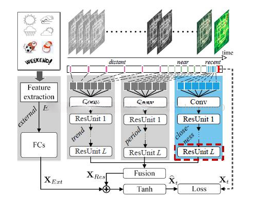 三个角度出发,空间、时间、额外因素建模,以残差神经网络(DNN改进,可让网络层数变得更深)为模型基础。时间影响:时间轴上分段采样,近(时刻)、中(天)、远(周)。空间影响:在近中远三段数据上分别采用多层残差神经网络。额外因素:利用全连接神经网络建模。近、中、远三个模型输出经过加权融合后生成图中Xrex,并和Xext激活后生成X't。结合下图理解。