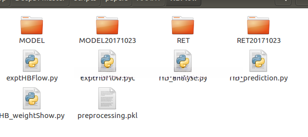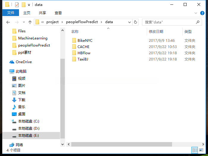 data:数据目录,deepst程序依赖包目录,scripts主体程序入口,script中分为北京出租车、纽约自行车、**省人群流动预测:exptTaxiBJ.py模型建模训练程序,HB_analyse.py测试集分析呈现,HB_prediction.py模型预测函数,HB_weightShow.py模型参数分析呈现,MODEL训练生成的模型,RET模型训练过程记录,preprocessing.pkl保存归一化对象,数据集data:分别是北京出租车、纽约自行车、**省人群流动数据集,CATCH为第一次运行程序读取原数据集后,自动生成模型的输入数据集。