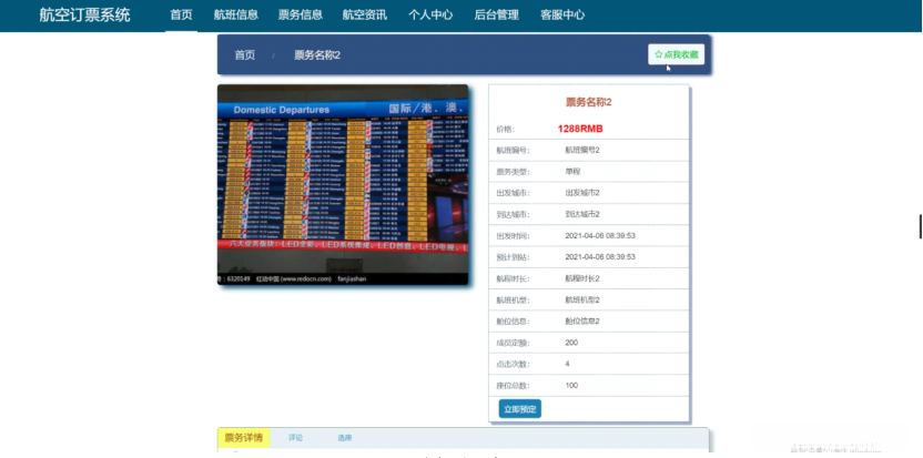 在票务信息页面上浏览..., 包括: 票务名称, 价格, 图片, 航班编号, 票类类型, 出发城市, 目的城(到达城市), 出发时间(出发时间), 到达时间(预计到站), 航程时长(航程时长), 航班机型(航班机型), 座位状态(舱位状态), 用户互动记录(如点击次数)以及空闲座位数量等详细信息,并支持预订航班的具体行程和其他相关操作(如收藏);如图5-3所示。