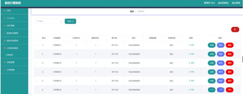订单评价管理功能,在相应的页面中提供了丰富的信息管理功能。具体来说,在该页面中用户可对订单索引号、订单编号等字段进行详情查看,并支持增删改修等基本操作(如图5-11所示)。