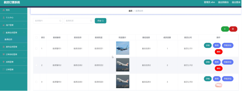 航班信息管理功能在航班信息管理页面上提供多样化的操作选项包括对索引航班编号航班名称航班机型机型图片舱位信息成员定额以及航空公司相关信息的支持用户可通过选择相应的功能进行详细资料修改记录查看评论或删除相关数据如图5-9所示