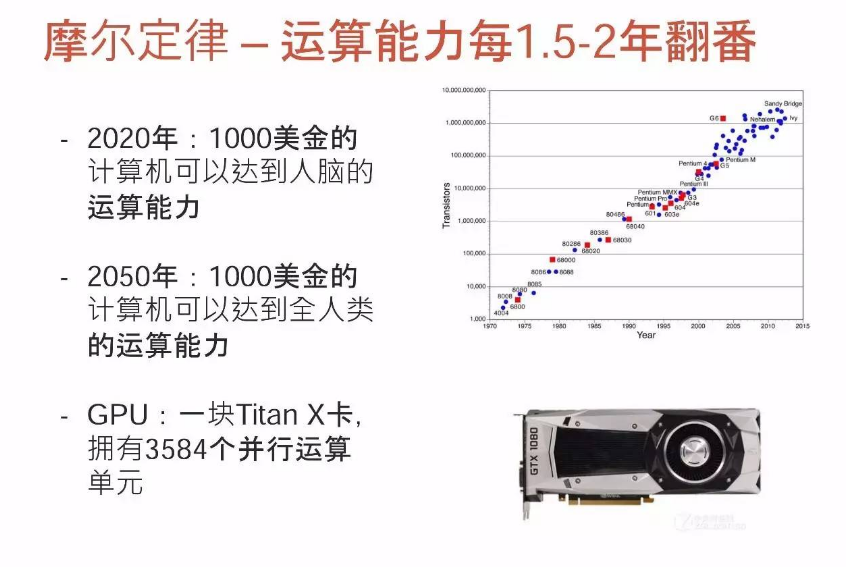 而另一方面,相对应地,现阶段的发展已经可以提供一定的上述条件了。第一,由于互联网、物联网的盛行,每个活跃的个体和物件都在产生数据,这些数据是可收集和利用的,为AI提供了天然食材。第二,由于计算机摩尔定律,计算机的计算能力也在不断地增长,市场上的各种超算芯片也不断出现,这是有目共睹的。第三,算法的创新也吸引了更多人加入。现在每年AI的顶会,比如cvpr、iccv等,都会接收几百、上千甚至是好几千篇论文,不敢说每一篇都是真材实料,但也还是有一些让人眼前一亮的。
