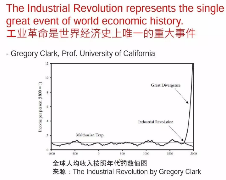 首先,有一张很经典的图。这个图要说明的是,在工业革命以前,人类获得的进步其实是很微小的,而进入工业革命以后,出现了很多以前所没有的东西,社会才获得了巨大的进步,甚至可以说今天人类大部分美好的样子都是工业革命带来的。而由于工业革命的创新性,人类社会的发展加速加速再加速。