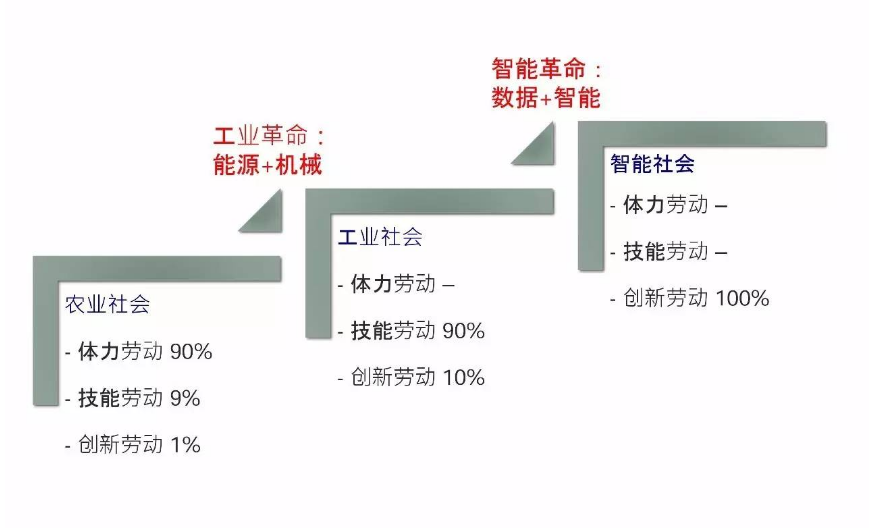 所以,可以想象,人工智能时代的到来,也将会颠覆社会的发展和人类的进程。雷老师还给出了另一幅图:这是不同社会进程下人类从事劳动的对比,如果是真的,那么在未来,具有创新性的人才将会成为世界的主宰者,所以老师天天和我们讲要培养创新精神,真的不是搞笑,是认真的,后悔自己脑洞开太小了吧,从前你认为的那些学习不好的、“不正经儿”的怪小孩,以后可能是社会最大的生产力。