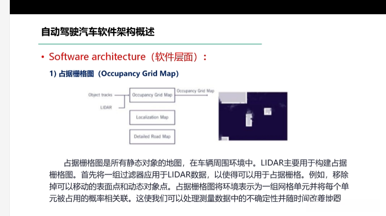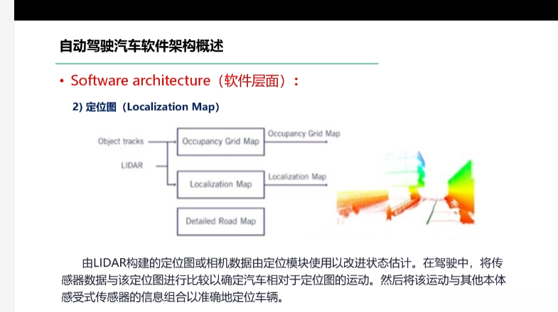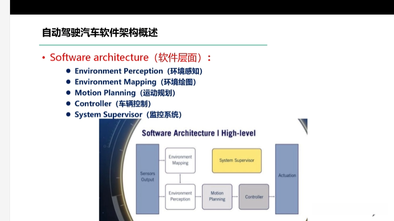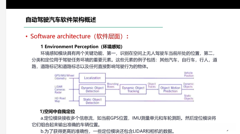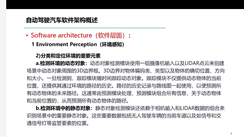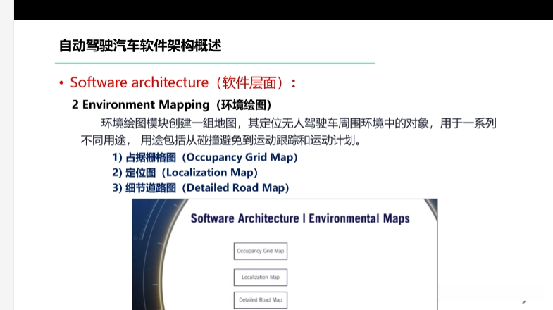 第一章自动驾驶技术概论第三节自动驾驶汽车技术架构 3.1自动驾驶汽车整体架构 3.2环境感知传感器技术 3.3定位系统 3.4定位系统高精地图技术概述 3.5规划与决策系统概述 3.6V2X技术概述