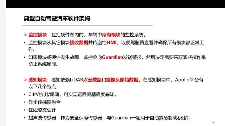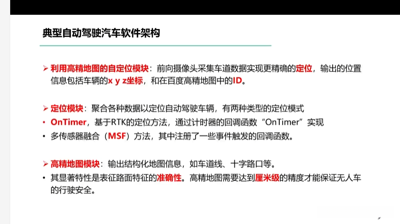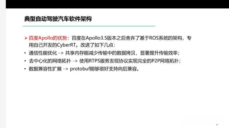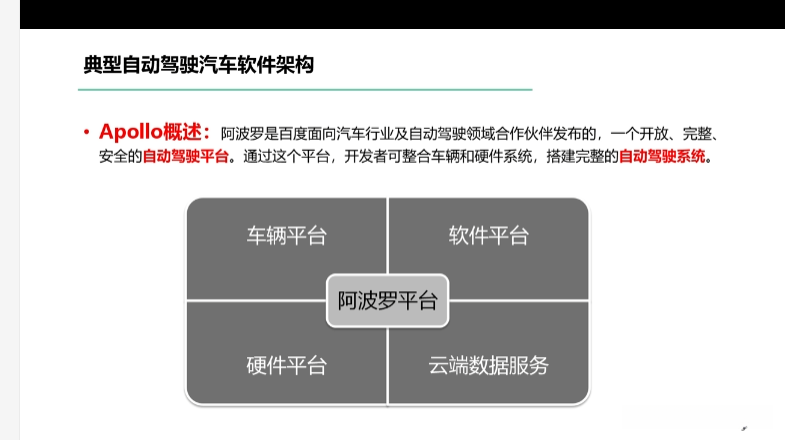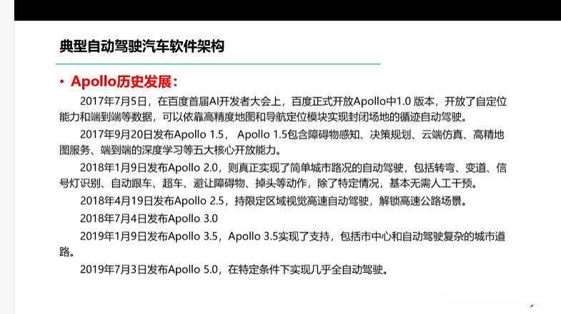 第二章自动驾驶汽车平台技术基础第四节典型自动驾驶汽车开发平台 4.1百度自动驾驶平台Apollo发展历程 4.2Apollo架构 4.3Apollo功能模块介绍 4.4Apollo特点