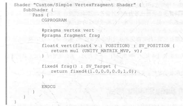 * 和表面着色器类似,顶点/片元着色器的代码也需要定义在CGPROFRAM和ENDCG之间。但不同的是,顶点/片元着色器是写在Pass语义块中,而非SubShader内的。