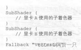 * 当unity需要加载这个unity shader时,unity会扫描所有的subshader语义块,然后选择第一个能在目标平台运行的subshader。