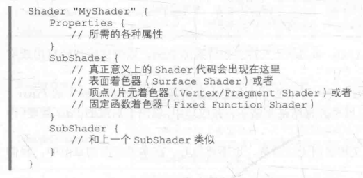 * 一个unity shader的基础结构如下: