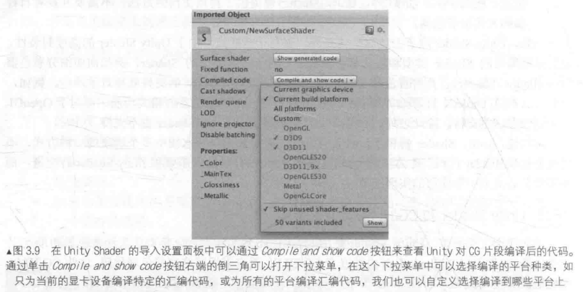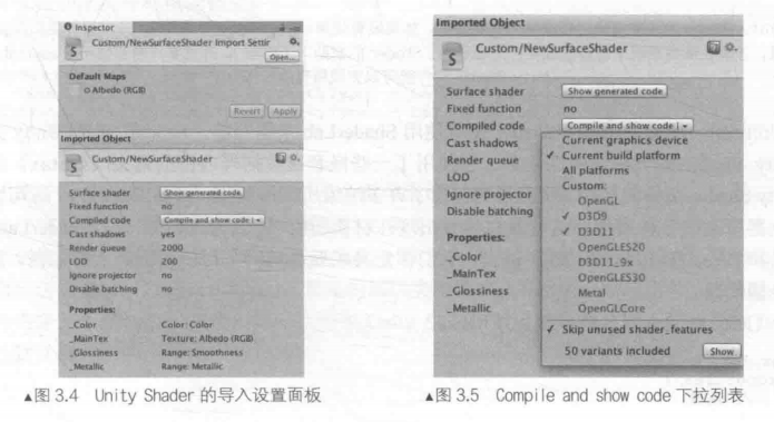 * 正如在3.1.3节中看到的一样,我们可以在 Unity Shader 的导入设置面板上查看这些编译后的代码,查看这些代码有助于进行Debug或优化等。