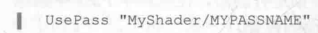 * 通过这个名称,我们可以使用SahderLab的UsePass命令来直接使用其他Unity Shader中的Pass。例如: