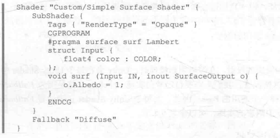* 一个非常简单的表面着色器示例代码如下:
