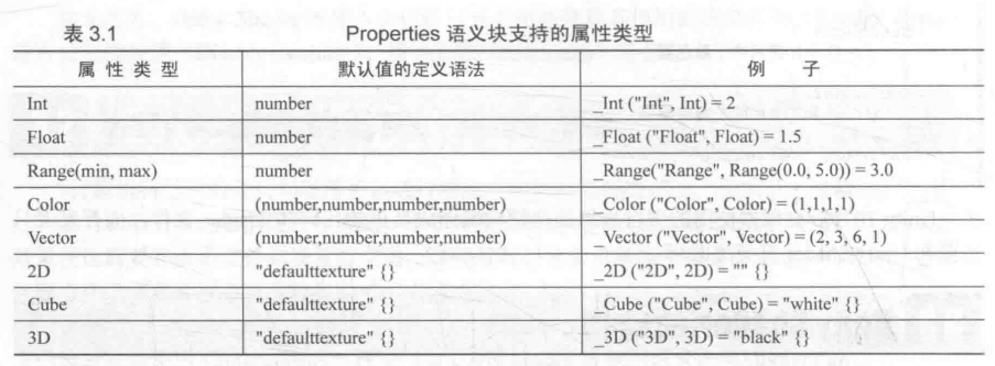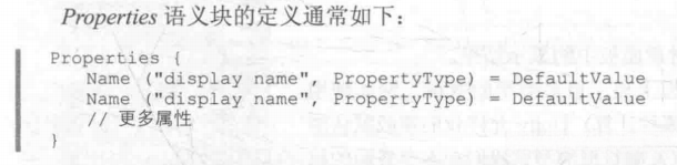 * Properties语义中包含了一系列属性(property),这些属性会出现在材质面板中。