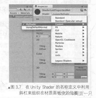 * 例如,“myshader”。通过在名字添加斜杠/,控制unity shader 在材质版中出现的位置。