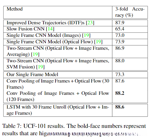 3.证明了光流图像能够提升分类性能并用实验结果说明即使在光流图像本身存在大量噪声的情况下(如在Sports-1M数据集中),与LSTM结合后仍然对分类有很大帮助。