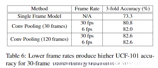 该数据集视频较短,所以可以用更高的帧率抽取视频。下图是以不同帧率抽取视频的对比。由第一行结果推测,相同帧数下,帧率小,意味着送入更长视频,所以准确率会提高,但是再继续降低帧率到1秒1帧,效果就不会提升了。因此,当帧率下降到足以看到整个视频的上下文内容,再降低帧率也不会对结果有提升。