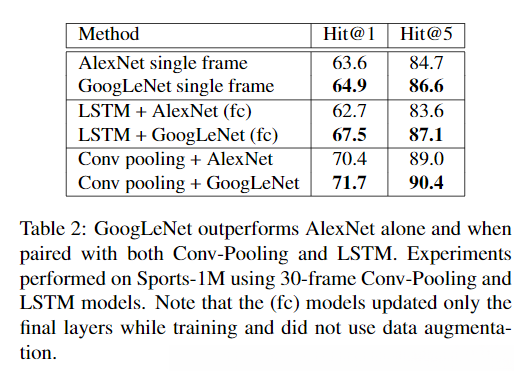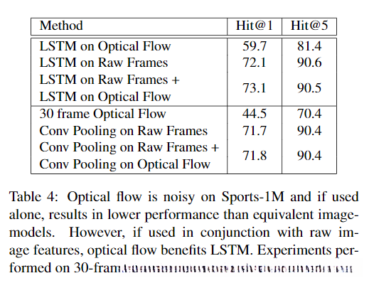 增加光流特征的效果如下图,可以看见在特征池化模型加入光流特征中没有太大提高,而LSTM加入光流特征后有较大提高,是因为LSTM能将光流特征用于后期特征融合,而特征池化模型却无法做到这样。所以使用光流并不总是有用的,特别是如果视频是从野外拍摄的,就像在 Sports-1M数据集里的情况一样。为了在这种情况下利用光流,有必要使用更复杂的序列处理体系结构,比如LSTM