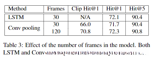 实验证明,第一种池化方式效果最好,第二种最差,指出在池化操作前保留原来的时空信息很重要,第二种方法直接将帧特征输入到全连接层,损失了时空信息,得到高层特征。最后一种方法效果也差,说明时域卷积层的效果不如max-pooling