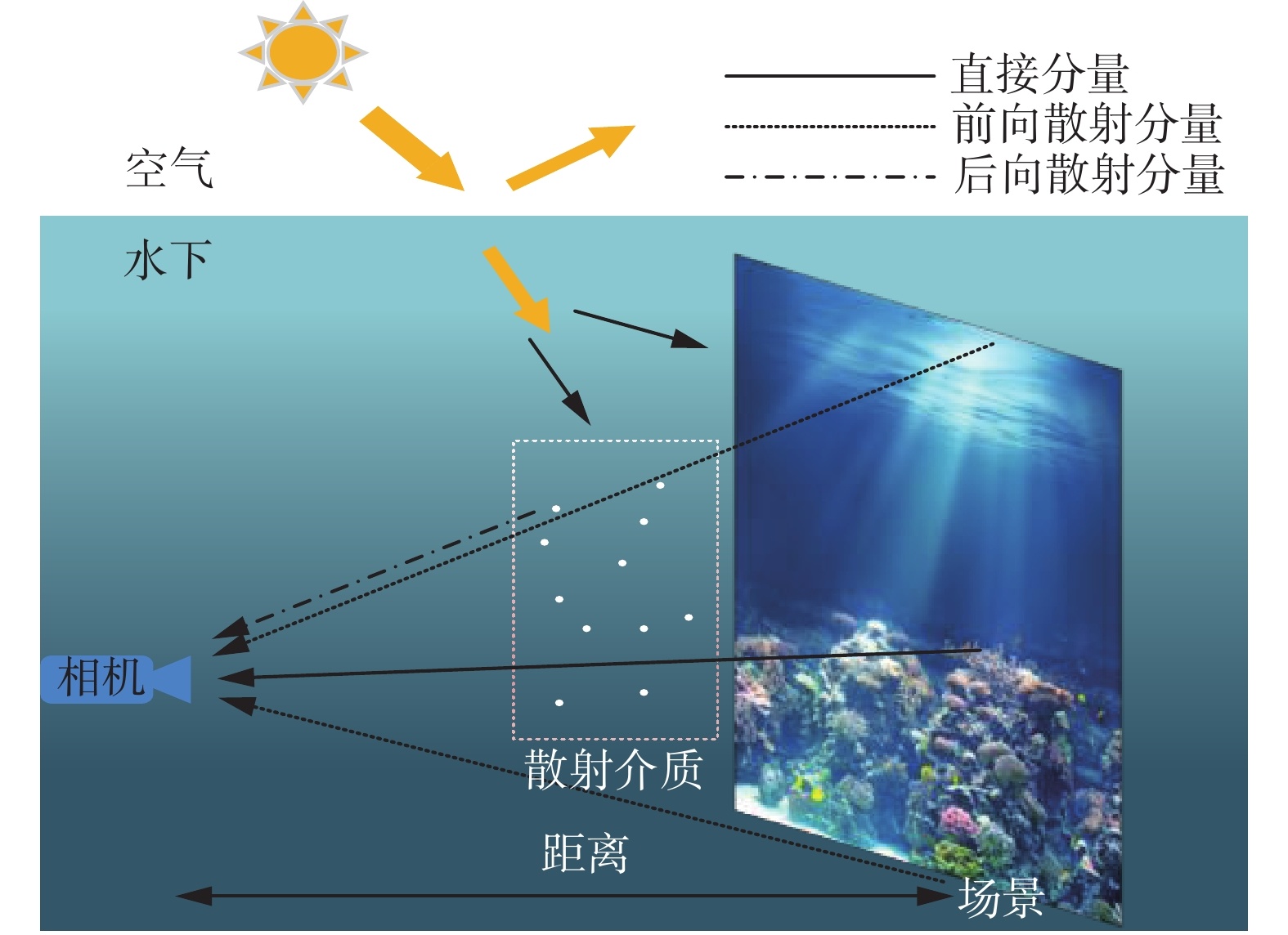 水下图像的退化程度受到多种环境因素的影响。当所有相关的退化参数被准确掌握时,可以通过反演退化模型将退化的水下图像恢复为清晰高质量的状态。根据Jaffe-McGlamey成像模型,在相机中接收的光信号可由三个线性分量叠加得到:直接衰减分量、前向散射分量以及后向散射分量(如图1所示)。其中,直接衰减分量源于场景直接反射到摄像机镜头中的光线;而前向散射则涉及场景反射光经微小粒子再次折射进入镜头的过程;后向散射则是周围光线经水中粒子折射后进入镜头的部分[20]。值得注意的是,在实际应用中相对于前向散射更容易去除其影响[21]。