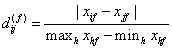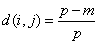 标称属性可以取两个或多个状态,设某对象的一个标称属性有M个状态。可以用数值或字符来表示。则对于这样的两个对象i和j,其相异性可以用不匹配率来计算: