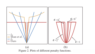 - 图2(b)描述了随着ε值逐渐减小, 损失函数逐步趋近于L0的形式.