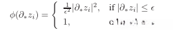该研究者提出了一种新的稀疏损失函数φ₀(·),其主要应用于迭代优化过程中的L₀范数近似。该函数通过操作梯度向量∇z来进行图像高频部分的正则化处理。其中符号代表水平或垂直方向。其数学表达式如下所示:对于每一个梯度向量∇*z_i,在所有i的情况下求和。其中所使用的φ(·)是一个分段定义的函数,在某一个梯度幅值小于等于阈值ε时取值为ε²乘以该幅值的平方;否则取值为1。
