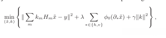目标函数由数据保真约束项、正则化项以及模糊核正则化项三部分构成,并可表示为以下形式:minx~,k{||∑m km Hm x~ − y||² + λ ∑∗∈{h,v} ϕ₀(∇∗ x~) + γ ||k||²},其中λ和γ为正则化权重参数。该目标函数旨在通过中间稀疏表示矩阵X~来捕捉图像中的关键边缘特征。
