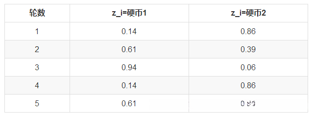 利用上面这个表,我们可以算出每轮抛掷中使用硬币1或者使用硬币2的概率。比如第1轮,使用硬币1的概率是: