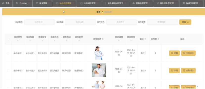 坐诊信息管理,在坐诊信息管理页面中可以对坐诊单号、坐诊标题、医生账号、医生姓名、联系电话、医生职称、医生照片、坐诊日期、就诊时间、备注、挂号费等信息进行详情、挂号问诊等操作,如图5-13所示。