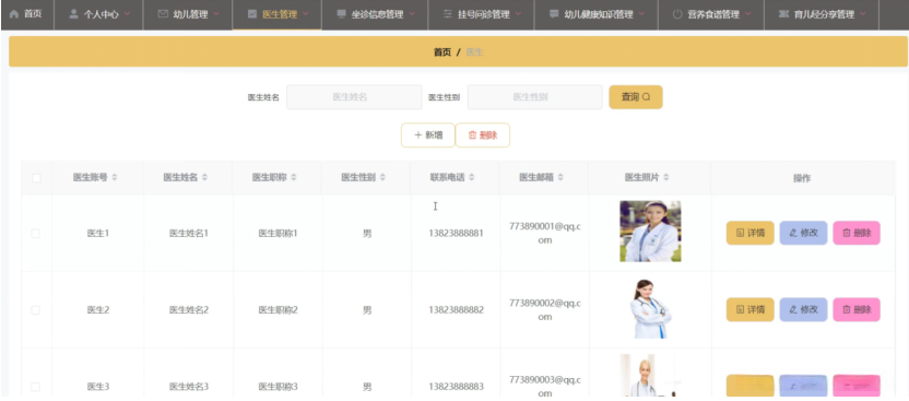医生管理,在医生管理页面中可以对医生账号、医生姓名、医生职称、医生性别、联系电话、医生邮箱、医生照片等信息进行详情、修改或删除等操作,如图5-9所示。