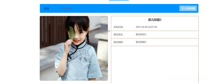 育儿经分享,在育儿经分享页面中可以查看育儿标题、育儿封面、发布时间、医生姓名、医生职称等信息,如图5-4所示。