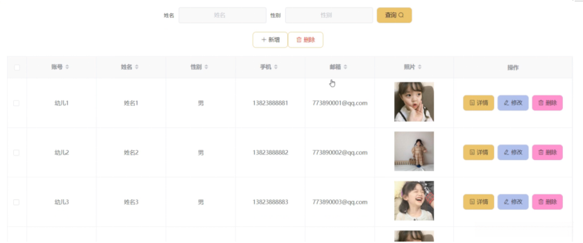 幼儿管理,在幼儿管理页面中可以对账号、姓名、性别、手机、邮箱、照片等信息进行详情、修改或删除等操作,如图5-8所示。