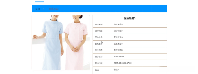 坐诊信息,在坐诊信息页面中可以查看坐诊单号、坐诊标题、医生账号、医生姓名、联系电话、医生职称、医生照片、坐诊日期、就诊时间、备注、挂号费等信息,并进行挂号问诊操作,如图5-2所示。