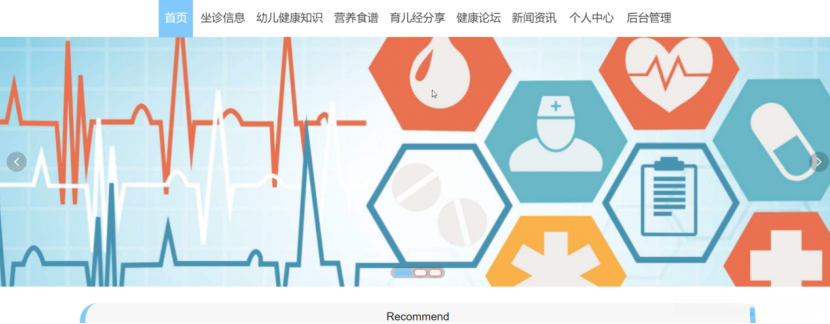 幼儿健康管理系统,在系统的首页可以查看首页、坐诊信息、幼儿健康知识、营养食谱、育儿经分享、健康论坛、新闻资讯、个人中心、后台管理等信息进行详细操作,如图5-1所示。