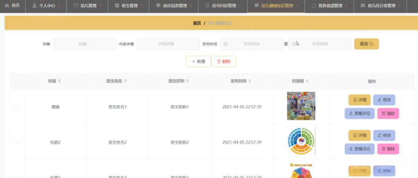幼儿健康知识管理,在幼儿健康知识管理页面中可以对标题、医生姓名、医生职称、发布时间、封面图等信息进行详情、查看评论、修改或删除等操作,如图5-11所示。