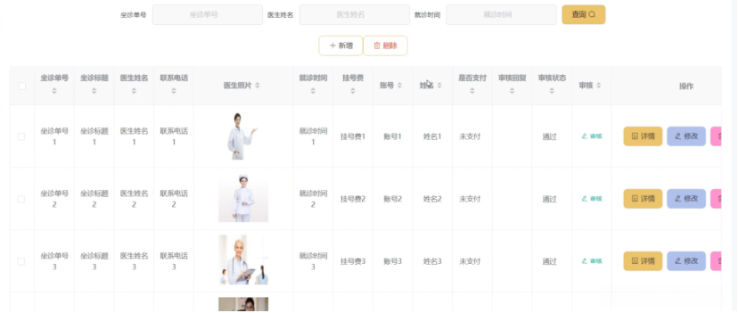 挂号问诊管理,在挂号问诊管理页面中可以对坐诊单号、坐诊标题、医生姓名、联系电话、医生照片、就诊时间、挂号费、账号、姓名、是否支付、审核回复、审核状态、审核等信息进行详情、修改或删除等操作,如图5-10所示。