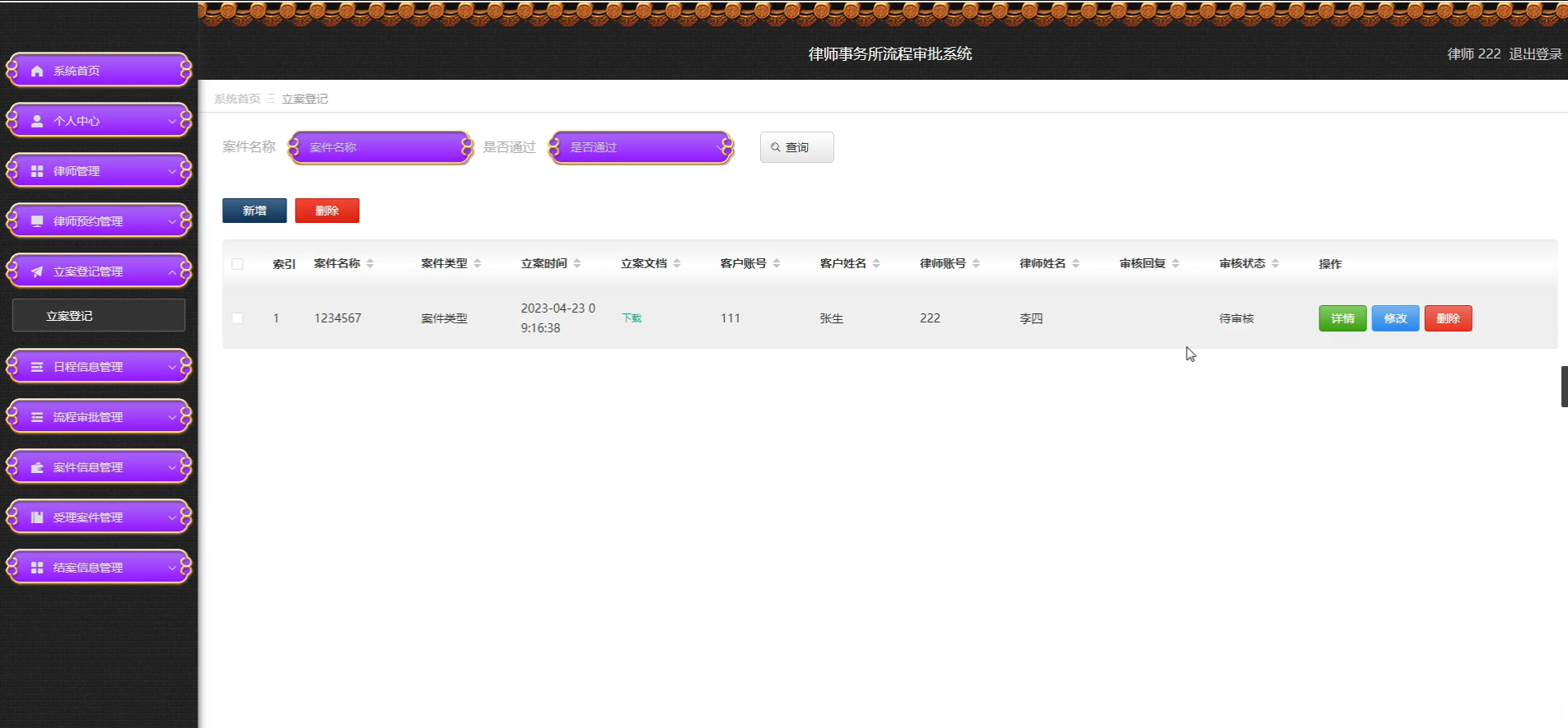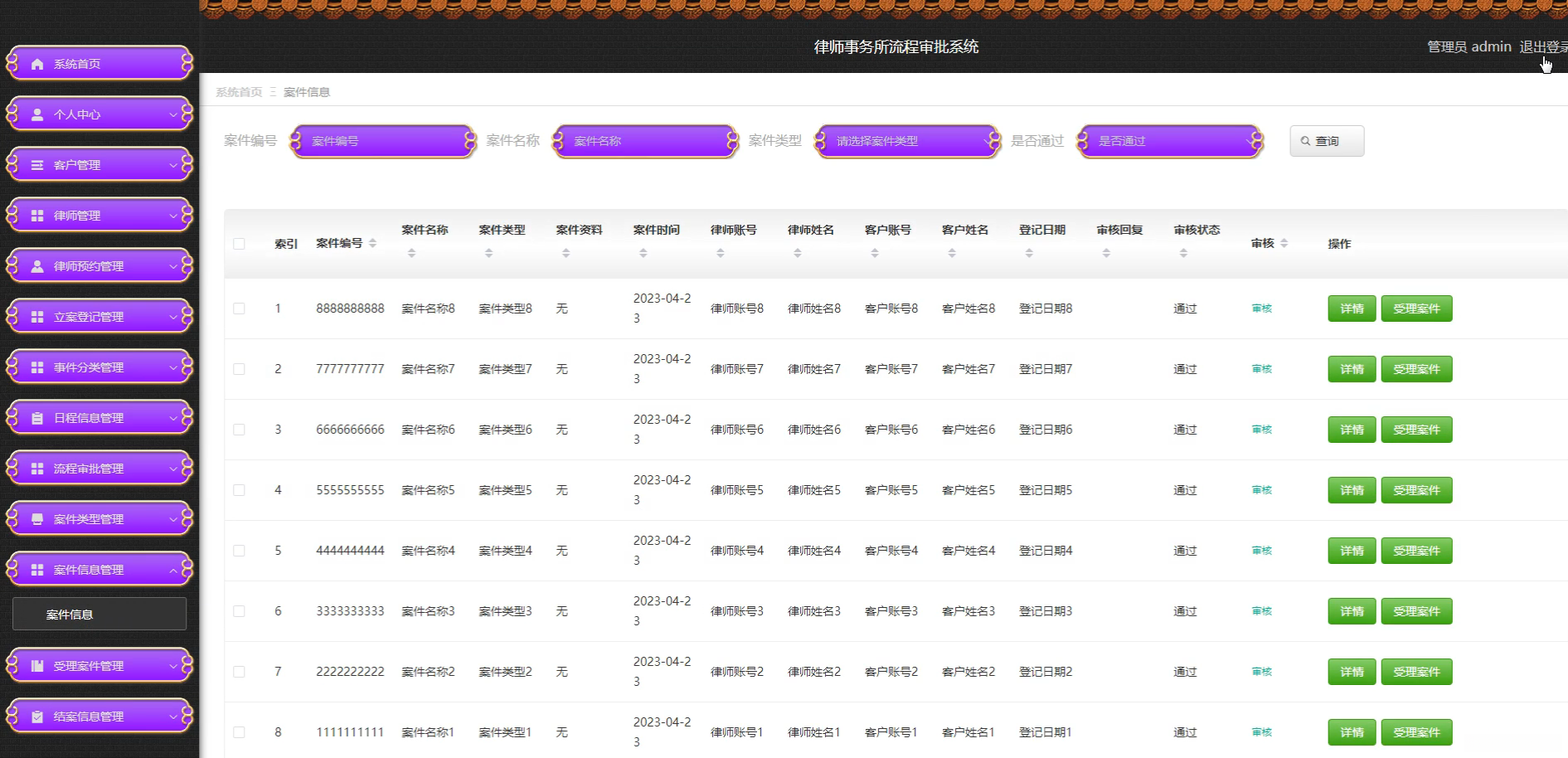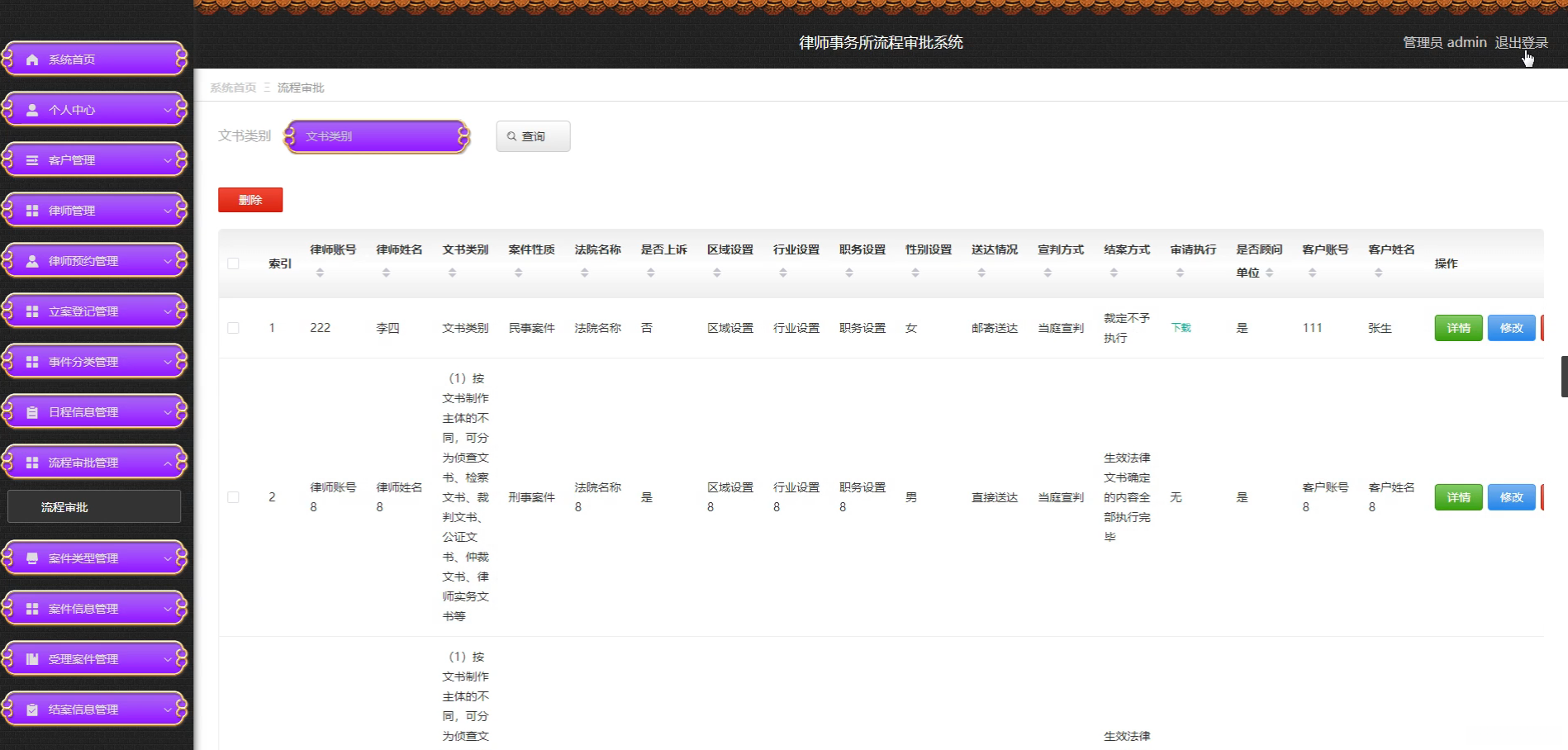 - 案件信息管理:详细记录案件进展,包括证据材料、法律文书等。
