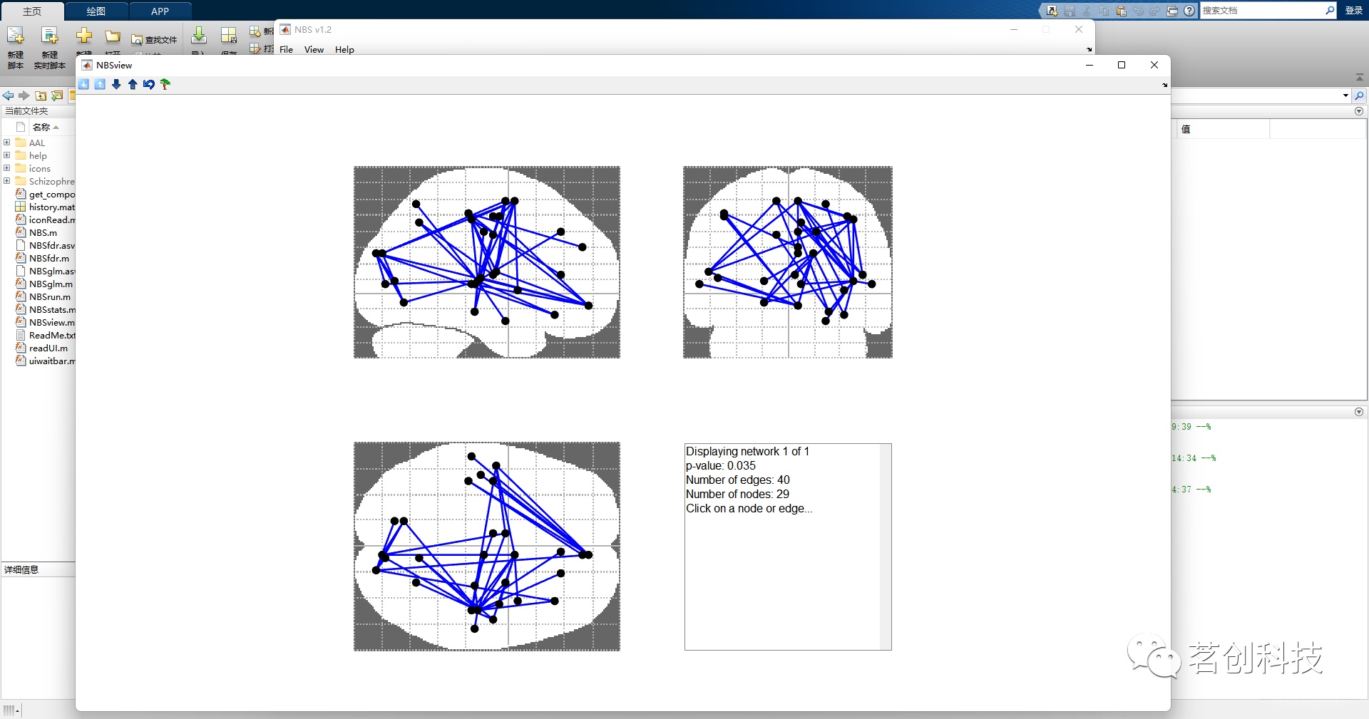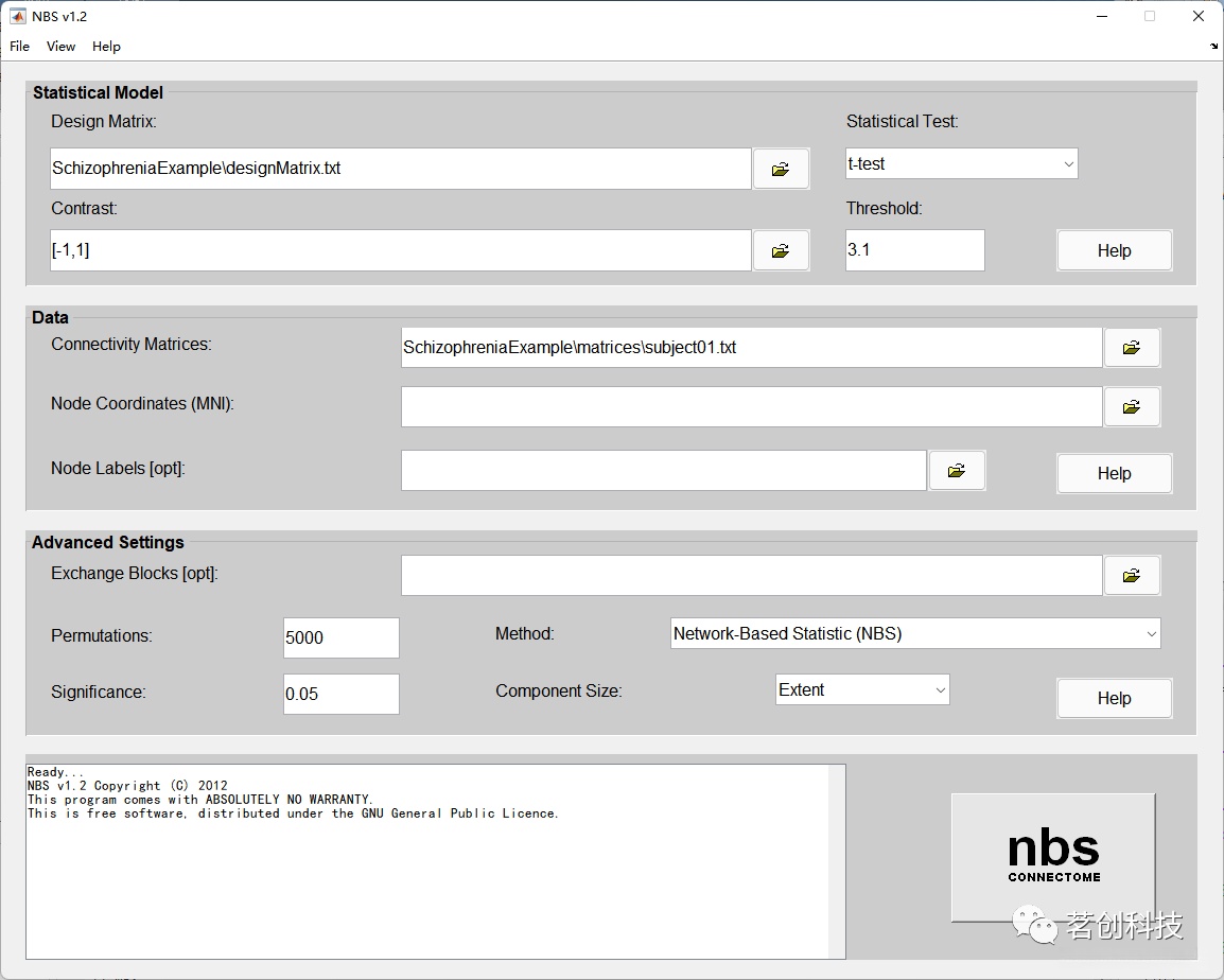 根据 NBS1.2 的官方手册,第一次使用 NBS 且想了解该软件,可先使用 cd 命令或直接将 matlab 当前路径文件夹更改为 NBS1.2,在命令框输入大写的‘NBS’,回车打开 NBS 后,不更改任何字段,点击右下角 NBS Connectome 按钮,即可准确复制最初 NBS 工作中呈现的精神分裂症研究结果(Zalesky et al, 2010)。(如下图所示)