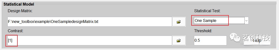 Statistical Model 中 Contrast 设置为 [1],Statistical Test 下拉,选择 One Sample;