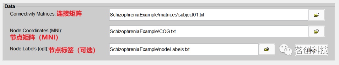 (1) Data 中的 Connectivity Matrices (Data中唯一的必填字段),选择储存被试的功能连接数据的文件;可输入的格式为文本文件(.txt)或者包含单个变量的 Matlab 文件(.mat)。