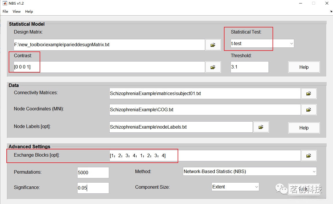 (1) Statistical Model 的 Design Matrix(设计矩阵):用于指定统计模型,可输入的格式为文本文件(.txt)或者包含单个变量的 Matlab 文件(.mat)。格式可参考:NBS1.2 文件夹内 SchizophreniaExample 文件夹下的 designMatrix.txt 及 designMatrix.mat 文件。