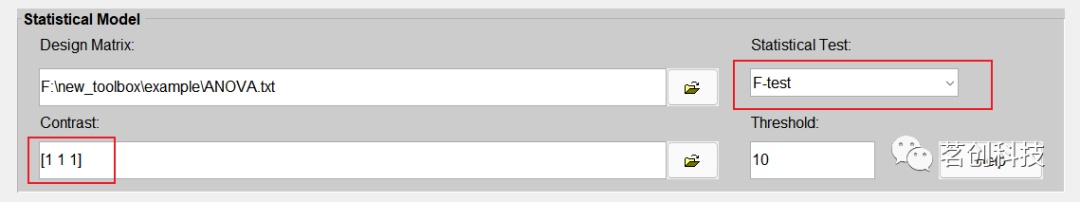 Statistical Model 中,Statistical Test 下拉,选择 F-test,比较三组之间是否有差异时 Contrast 设置为 [1 1 1];比较第一组是否大于第三组时 Contrast 设置为 [1 0 -1],以此类推。