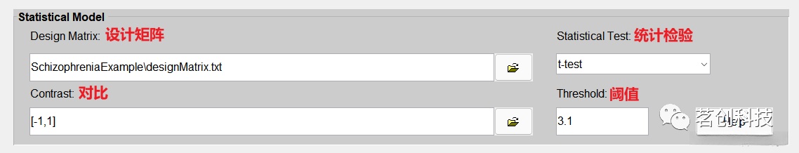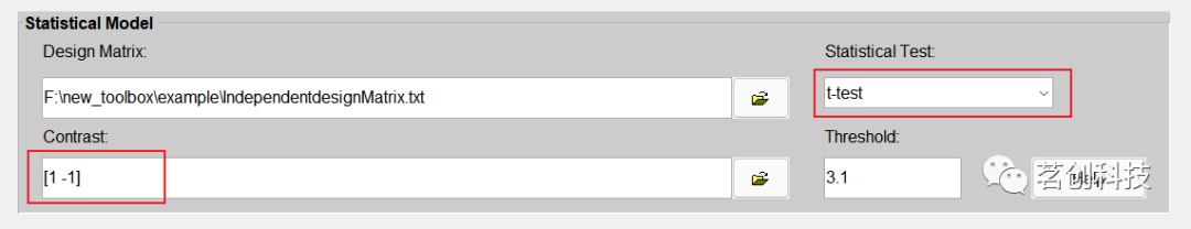 Statistical Model 其他设置:假设组1>组2时,Contrast 设置为 [1 -1](方括号一定不能少);假设组1<组2时,Contrast 设置为 [-1 1]。Statistical Test 下拉,选择 t-test;