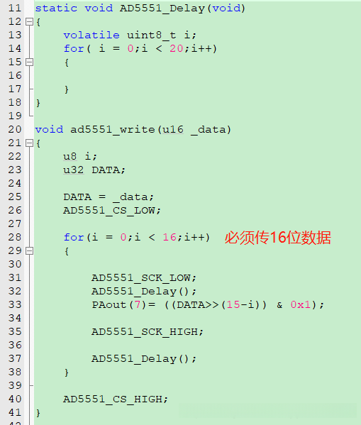 后来发现写这datasheet 时序图的人绝对是个傻比。 虽然是14位的DA,但是你也得把14位数据按照16位的格式传进去才行,心中顿时一万只草泥马。话不多说,上代码截图: