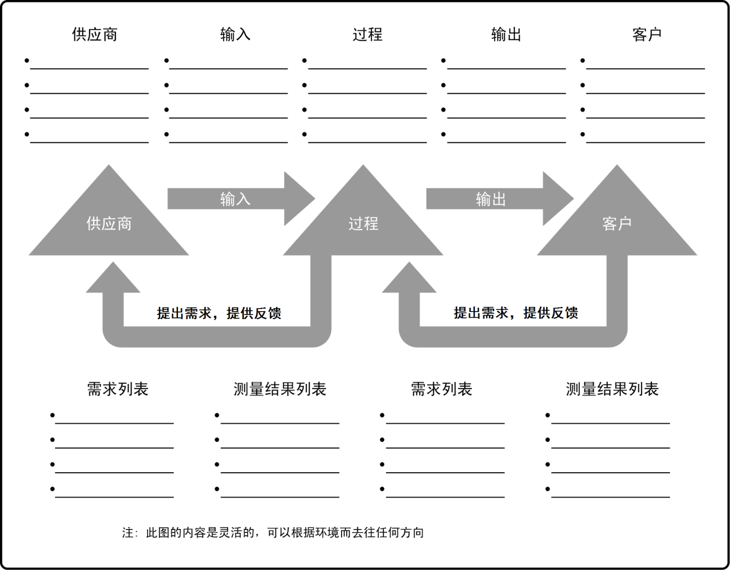 SIPOC模型----由戴明提出,用于组织流程管理和改进。通过分析,识别核心过程。戴明认为任何一个组织都是一个由供应者、输入、流程、输出、还有客户这样相互关联、互动的5个部分组成的系统。