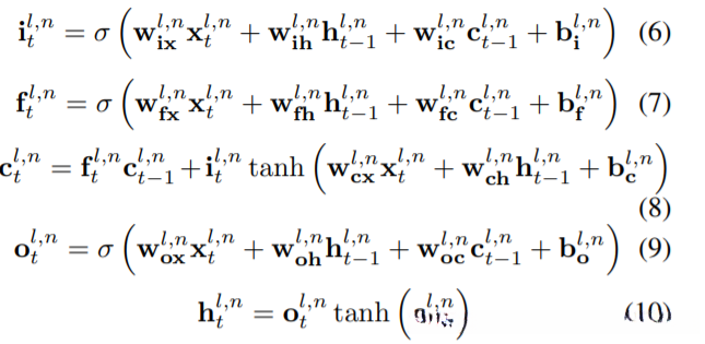 分别是TS-LSTM模型中第n个LSTM单元在第t帧时的输入门、遗忘门、细胞激活门以及输出门和输出向量。(6)-(9)中的所有矩阵w_{l,n,m}都是指第l个TS-LSTM网络中第n个LSTM单元从第n层到第m层的时间权重参数。
